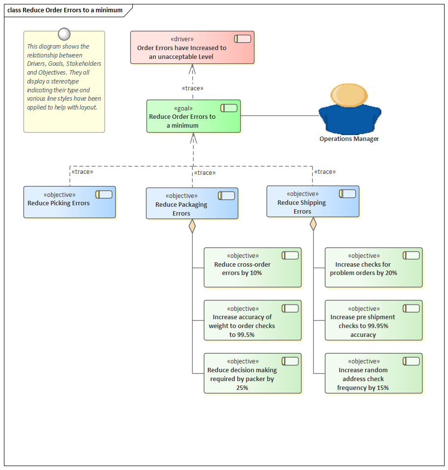 Enterprise Architect can be used to model the Goals and Objectives and relate them to each other, with each Goal being decomposed into a number of Objectives that can be measured. Stereotypes can be used to create Goal and Objective elements, and these can be added to any number of diagrams. The Browser window provides a way of structuring the Goals, adding the Objectives as child elements placed under the applicable Goal. The Specification Manager is a useful tool for creating, viewing or presenting the Goals and Objectives in a workshop. It is a text based tool and allows the Goals and Objectives to be viewed in a word processor or spreadsheet interface.