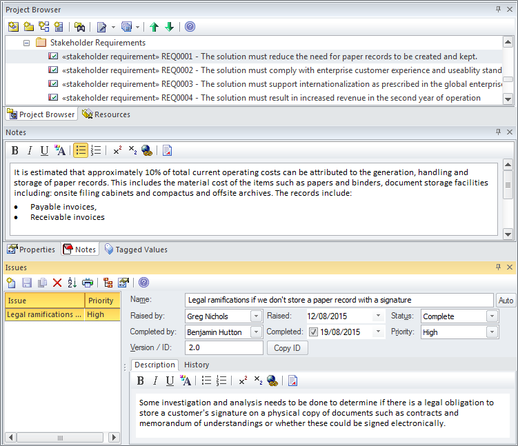 Enterprise Architect is a powerful modeling platform that has an impressive range of ancillary tools over and above its core modeling functionality, to assist the modeler working in a dynamic business environment. The implementation of a solution will take time, and stakeholders will have concerns and issues that will not have been present at the time they articulated their needs and requirements. These can be recorded in the model either at the level of the model or at the level of an individual element, such as a Requirement or any other element.