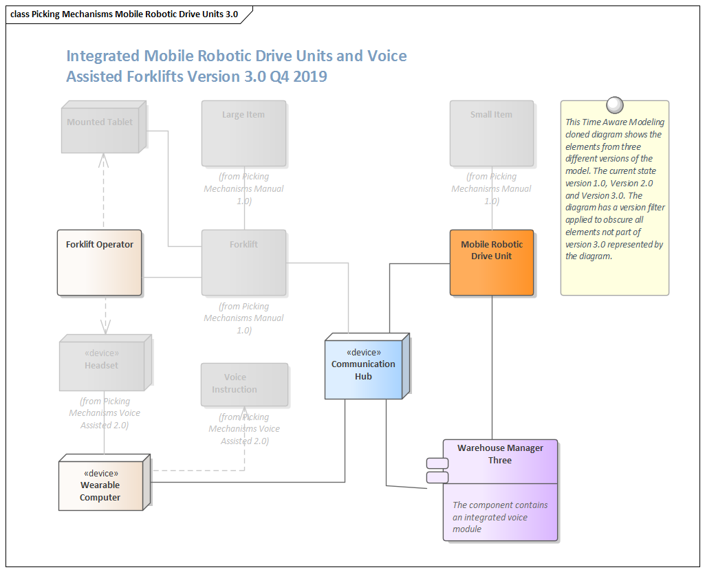 There is a wide range of tools that can be used in conjunction with Time Aware Modeling, such as the ability to filter a diagram to only highlight elements that are part of the version represented by the diagram. The effect of this will be to obscure all elements other than those that have been added or cloned into the specified version. The Traceability window can be used to keep track of the complex relationships that exist between different versions of the elements. Diagram Legends can be used to color the diagram's elements based on the version they belong to, effectively creating a colored chronology of change or transition from version to version. Diagram Filters can be used to obscure elements based on more complex criteria, such as to display only the elements that are part of either version 2 or 3 and that have a status of 'Approved'.
