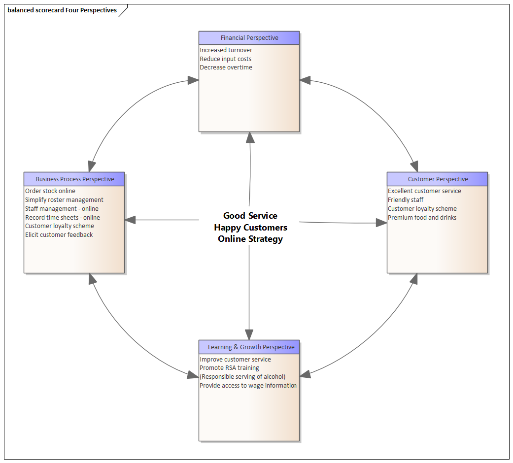 This diagram illustrates how the company vision and strategy is directly tied to each of the four perspectives. Resource allocation is based on results and strategy rather than a set of arbitrary financial numbers from the previous financial year. The Balanced Scorecard approach helps to ensure that business activity is engineered to adhere to company values and meet targets. Enterprise Architect allows each perspective to be linked to supporting documentation, model information and rigorous benchmarks that verify whether strategic initiatives have been undertaken and associated targets met.