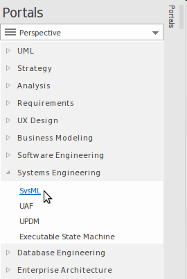 Systems Engineers who are experienced in using Enterprise Architect will generally select a Perspective from the Systems Engineering Perspective Set; typically this will be the SysML Perspective, giving them access to patterns and toolboxes tailored for creating SysML diagrams such as Block Definition and Internal Block diagrams.