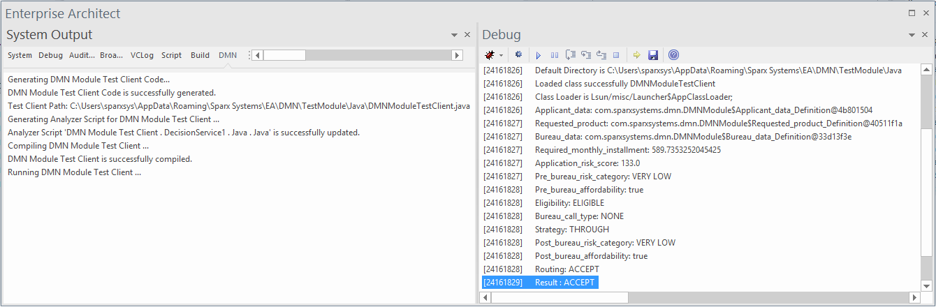 The execution result will be displayed in the Debug window. You can also open the test module file, set a breakpoint on the line and debug in the DMN Module to do line-level-debugging.
