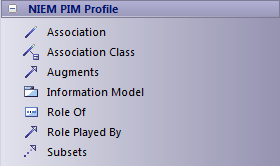 Each diagram type has its own page of elements and connectors in the Diagram Toolbox. The NIEM UML Profile also provides a page of elements and connectors common to all three diagram types.
