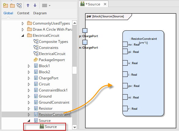SysML Parametric diagrams are dependant on Block definitions being created in the model. The parametric definitions apply equations as constraints on the properties of these Blocks. The equations have parameters that are bound to the properties of the system. Parametric diagrams use Constraint Blocks to define these constraints. These can be derived from the Block Definition or Internal Block Definition model.