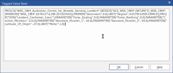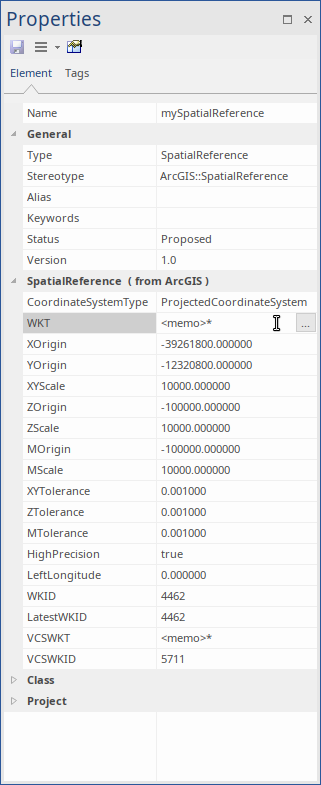 Click on the to close the dialog and return to the diagram. The Tagged Values for the Spatial Reference element are updated with the Coordinate System information you have selected. |