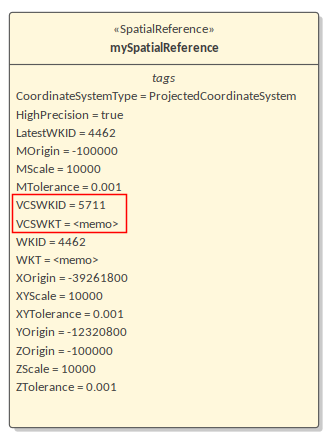 You can also add vertical coordinates to a selected Geographic or Projected coordinate system; the vertical coordinate is loaded to the VCSWKT and VCSWKID Tagged Values on the «SpatialReference» element.