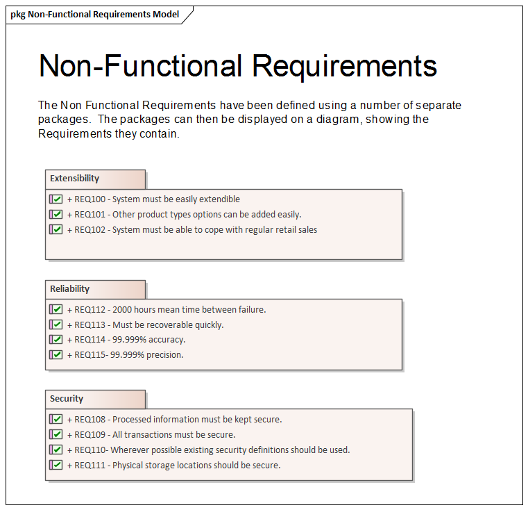 Quality Attributes are often grouped into sets, such as those pertaining to security or performance, or one of the '-ilities' such as Reliability. A requirements Package can be used to group these elements together which provides a convenient categorization for reporting. The Packages can be seen in the Browser window and can also be added to a diagram with the option to display the individual Requirements inside the Package.