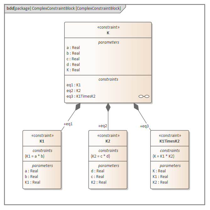 In this example, the Constraint Block K does not itself define any constraints, but as a composite inherits them from its three component Constraint Blocks K1, K2 and K1TimesK2. Constraint Block K inherits the five parameters a, b, c, d and K.