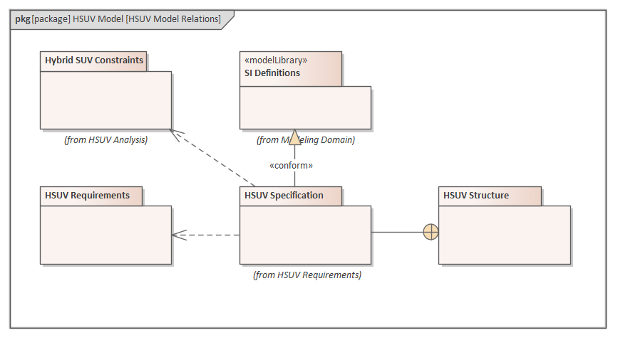 A SysML Package diagram provides a means of visualizing the organization of a complex model into recognizable containers, which helps you to group the structures of the model and define high level relationships between these groupings. The structures can include name-spaces and their sub-Packages, and other less formally defined groups of elements. The basis of allocating structures to Packages could be, for example, access control, configuration Management, ease of navigation, or dependency level.