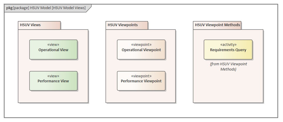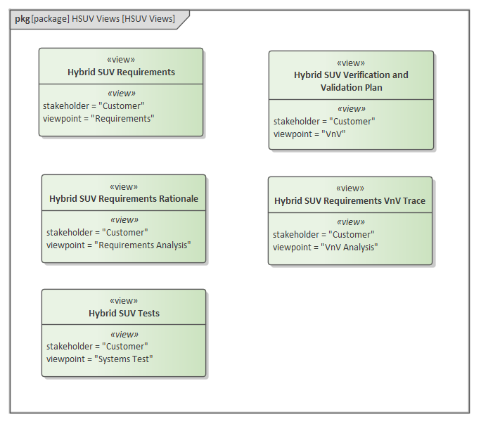The main element represented in the Package diagram is the Package itself, which can represent a complete Model, a Model Library of commonly-used objects (such as definitions and values), or a Package as a container. The diagram can also show two stereotyped Class elements - a SysML View, which defines an aspect of a system, from a perspective defined by a SysML View Point. The diagram can contain no relationships, simply indicating how objects are grouped, or it can show a number of relationships to indicate how the Packages are interlinked. For details of the element and connector types, see the SysML Model Toolbox Help topic.