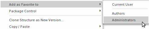 To add a Package to a 'Favorites' list, right-click on it in the Browser window and select the 'Add as Favorite to' context menu option. A short menu displays, listing 'Current User' and the security groups to which your user ID has been assigned.