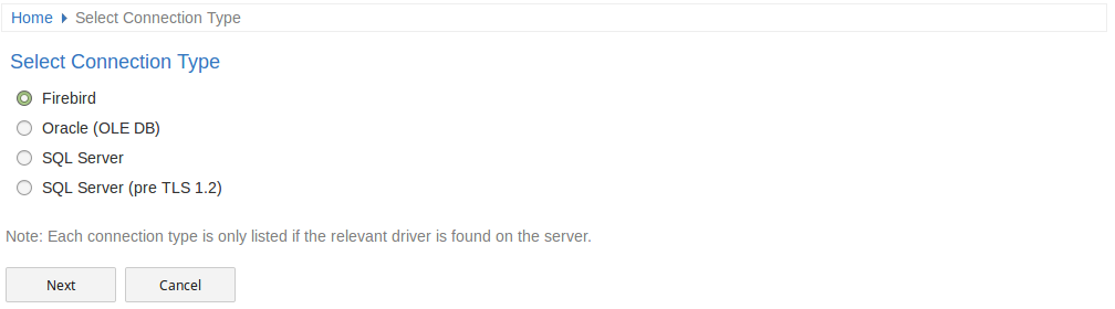- The DBMS types (such as Oracle and SQL Server) are only listed on this page if the relevant drivers are found on the server