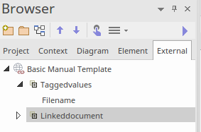 The 'External' tab of the Browser window displays only when you are reviewing external items. It behaves in much the same way as the 'Element' tab of the Browser window, revealing the external element's relationships, features, requirements, Tagged Values, project maintenance items and related files. However, the 'External' tab shows only categories for which items exist, and does not list all possible but empty categories.