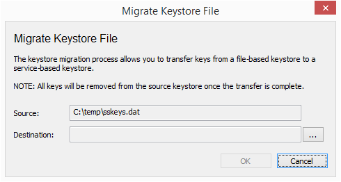 To migrate shared keys from other keystores, you must first define a connection to each source keystore, using the 'Link to' context menu option in the 'Key Stores' list. Then, making sure the source keystore is selected in the list, select the 'Migrate to...' context menu option.