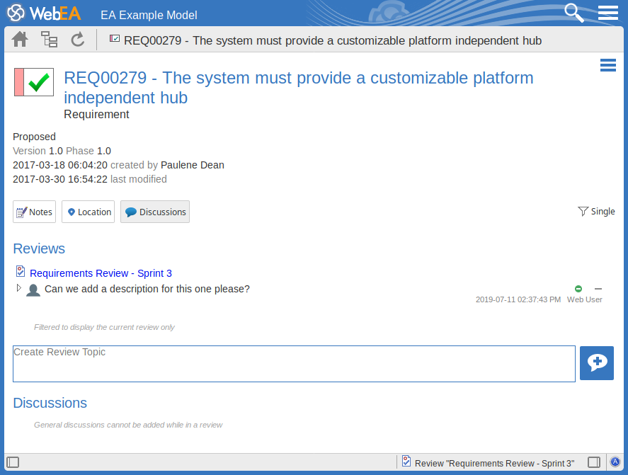 Review elements are a convenient way for groups of users to collaboratively discuss one or more model objects and capture those discussions as a formal review. A Review element is a custom element that captures all discussions that you participate in over a period of time. That period begins when you select to 'join' the review, and ends either when you select to leave the review, or when you log out of the current model. You can also return to the review in a subsequent work session and your continuing discussions are also captured. The Review element would typically have a start and end date set to define the duration of the review.