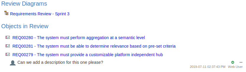 When a Review element is created, a child diagram is also created, automatically. Both Enterprise Architect and WebEA consider any element added to this diagram as requiring comment during the Review. When the properties of the Review element are loaded in WebEA the 'Objects in Review' section will contain a list of all elements that have already been commented on or have been added to the Review diagram. This list provides a convenient way to quickly navigate to each element in the Review.