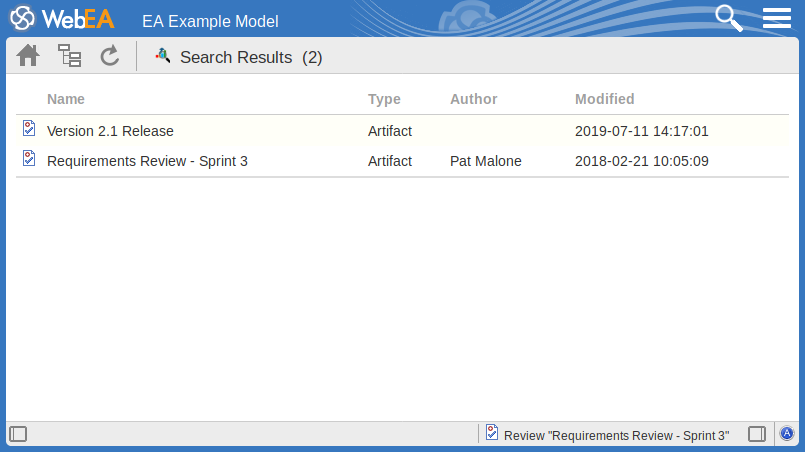 To check on recent Review elements available in the model, click on the 'Search' icon in the WebEA header and select the 'Reviews' option. This conducts a search for recent Review elements and lists them in the 'Search Results' view, with the most recently changed element at the top of the list.