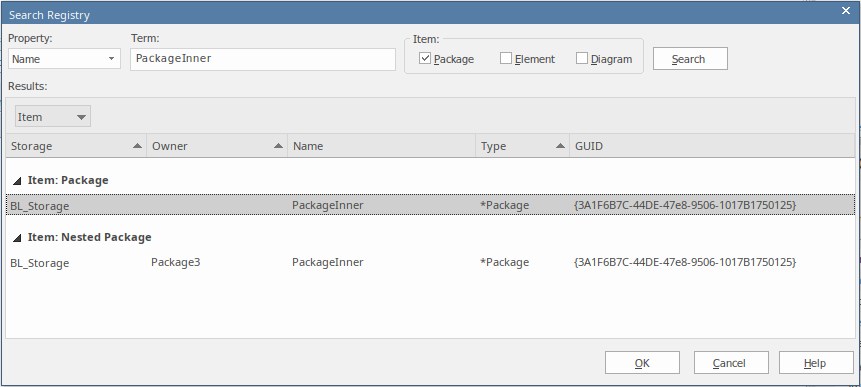 Select an entry in the 'Results' section and click on the OK button to open the Storage (containing the modeling item) in the Registry Browser and close this dialog.