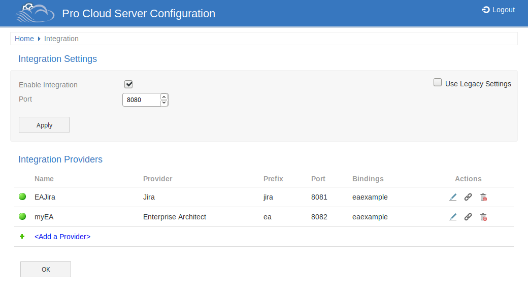 The 'Integration Settings' page allows you to configure integration plug-ins to be used with Pro Cloud Models. These plug-ins enable data from external providers to be displayed within Enterprise Architect. This component is only available in the licensed editions of Sparx System Pro Cloud Server; that is, Token, Team and Enterprise editions.