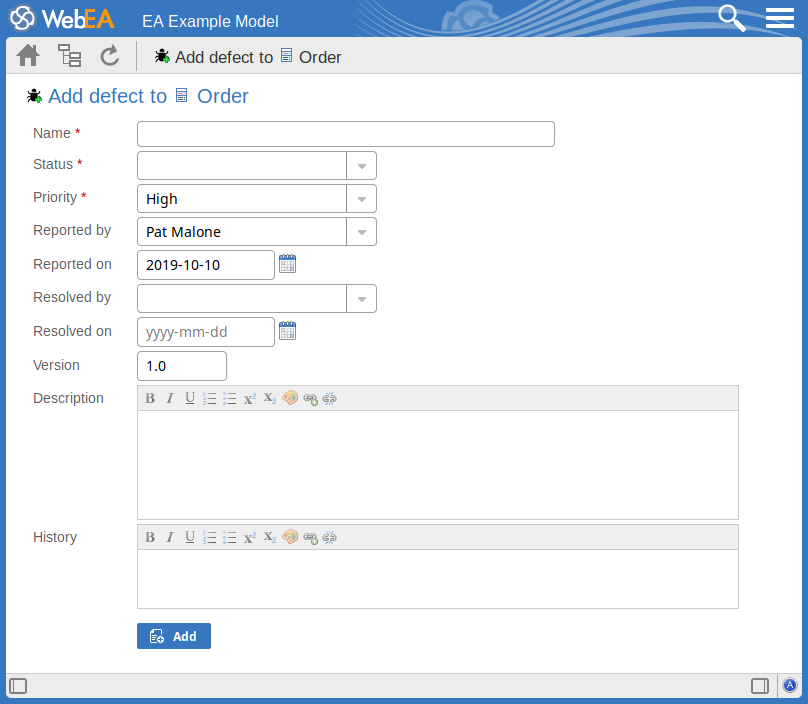 If there is any background to this defect, such as previous occurrences, document them here (you might copy the 'Description' from the last version or iteration of this defect record, for example). It is recommended that you include a date stamp and user initials in the entry. You can format this text using the facilities provided in the Notes toolbar. |