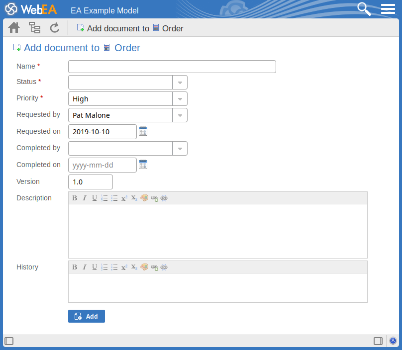 Click on this button to submit the details and create the document record on the selected element. This message is displayed: Document <name> was successfully added to <element name>. Either: