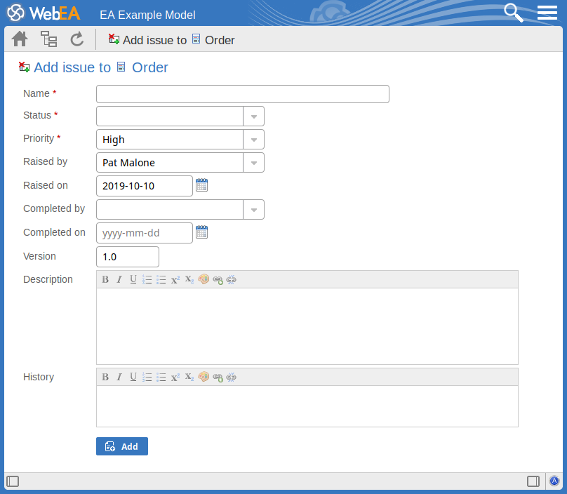 Click on this button to submit the details and create the issue report on the selected element. This message is displayed: Issue <name> was successfully added to <element name>. Either: