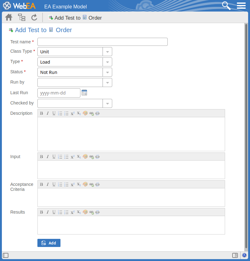 Click on this button to submit the details and create the Test record on the selected element. This message is displayed: Test <name> was successfully added to <element name>. Either: