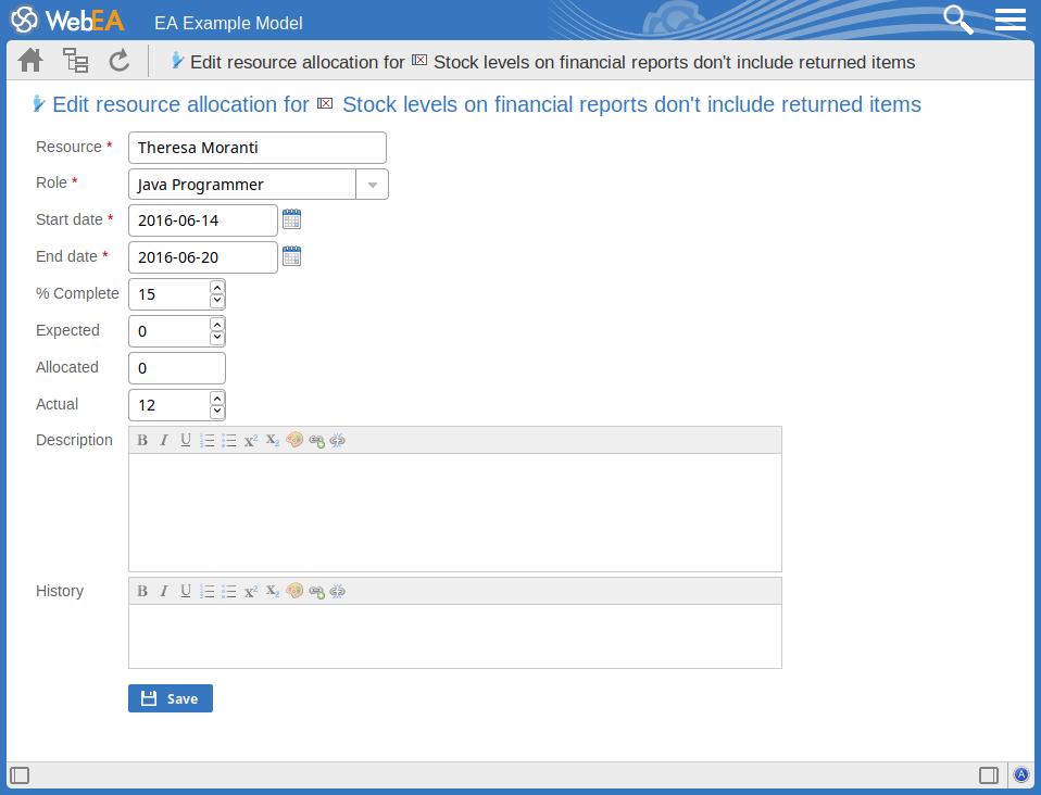 If necessary, edit the description of the resource allocation, perhaps to explain the changes you have made to earlier fields. You can format this text using the facilities provided in the Notes toolbar, as explained in the Edit Notes section. Before changing the text, you might want to copy it to paste into the 'History' field for editing there. |