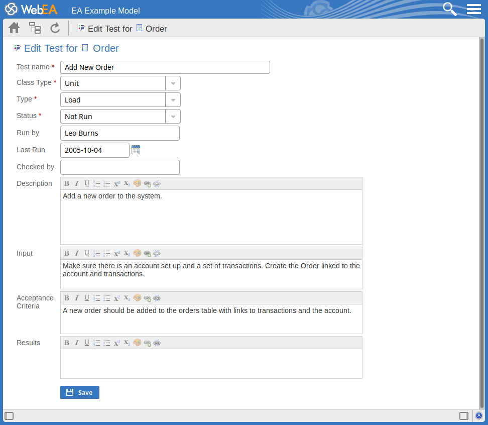 The tests assigned to an element support a range of situations including user acceptance and scenario. You could be asked to define or perform tests on parts of a model of relevance to you as a customer or user, or you might want to add information obtained from other people you have asked to perform an evaluation. Therefore, you might need to edit test records to update them with your information.