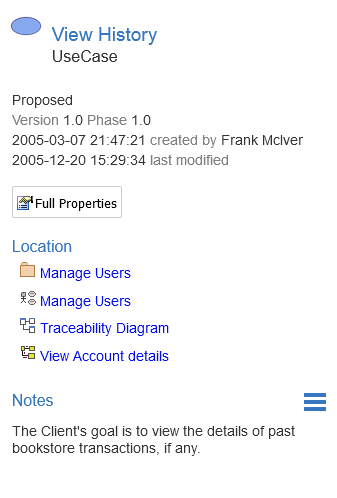 The Properties View is also displayed while viewing the Full Properties of an object in WebEA's Main View. This allows you to access one feature of the element (such as Notes) in the Properties View while also accessing another (such as Discussions) in the Main View.
