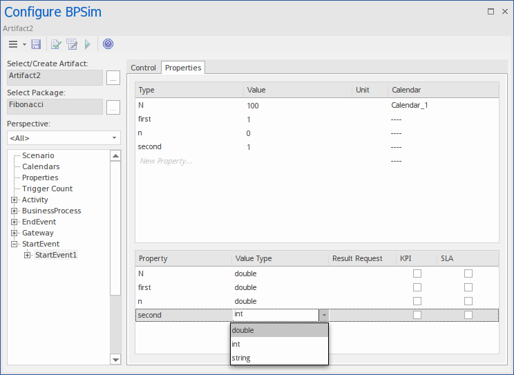 In Enterprise Architect release 13.0 and higher, BPSim property parameters can hold process instance data to which no value is assigned until run time. You can define the property parameter type on the 'Properties' page of the Configure BPSim window; the supported types are 'int', 'double' and 'string'.