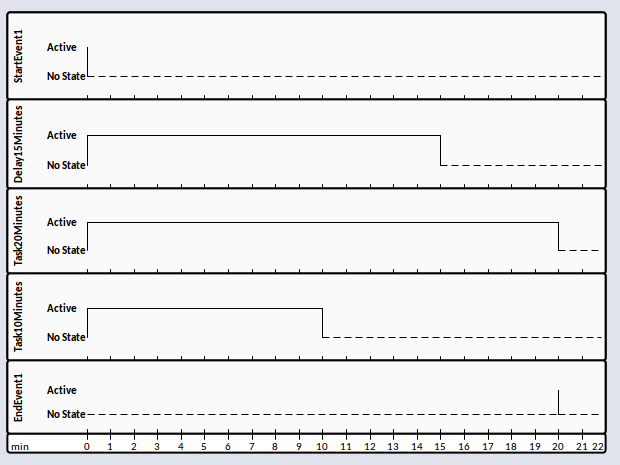 When the time parameters are configured on the BPMN elements, Enterprise Architect will be able to generate a Timing diagram for the simulation process.