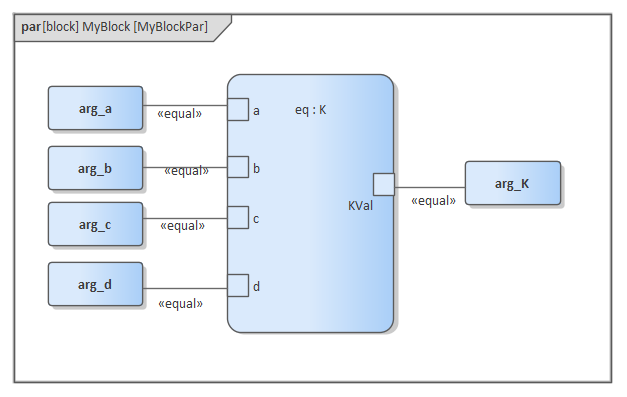 Create a Parametric diagram in Constraint Block 'K' and connect the parameters to the constraint properties with Binding connectors, as shown: