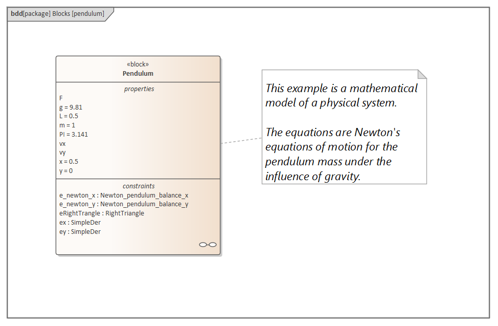 In this figure, constraint 'f = m * a' is defined in a Block element.
