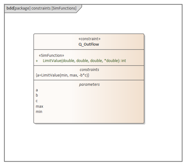 When generating code, Enterprise Architect will collect all the operations stereotyped as 'SimFunction' defined in Constraint Blocks and Blocks, then generate code resembling this: