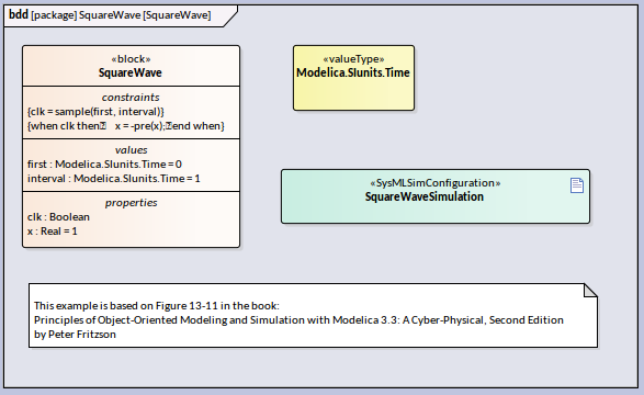 - We create a ValueType Modelica.SIunits.Time, which is used for the property first and interval of the Block SquareWave