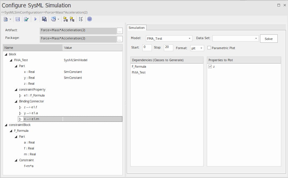 Connects two Ports. No configuration required in the Configure SysML Simulation view. However, you might have to configure the properties of the Port's type by determining whether the attribute isConserved should be set as 'False' (for potential properties, so that equality coupling is established) or 'True' (for flow/conserved properties, so that sum-to-zero coupling is established). |
