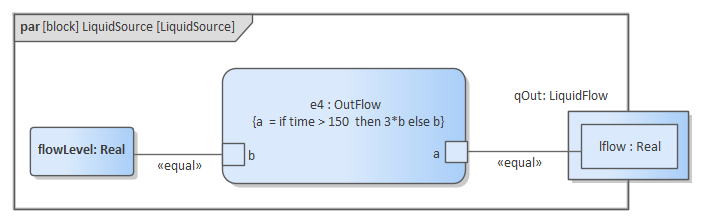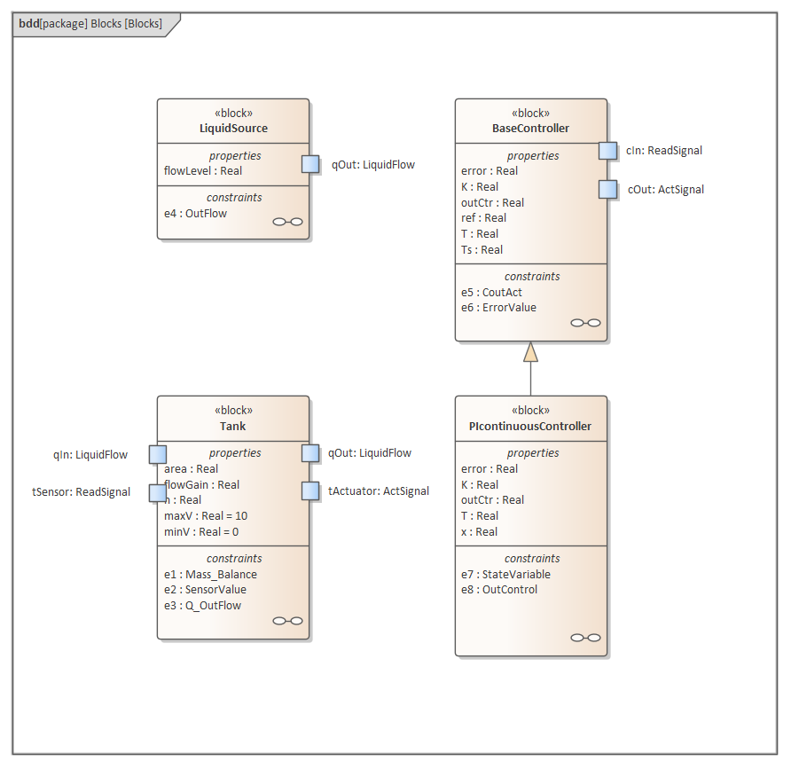 LiquidSource: The water entering the tank must come from somewhere, therefore we have a liquid source component in the tank system, with the property flowLevel having a unit of 'm3/s'. A Port 'qOut' is typed to 'LiquidFlow'. Tank: The tanks are connected to controllers and liquid sources through Ports.
