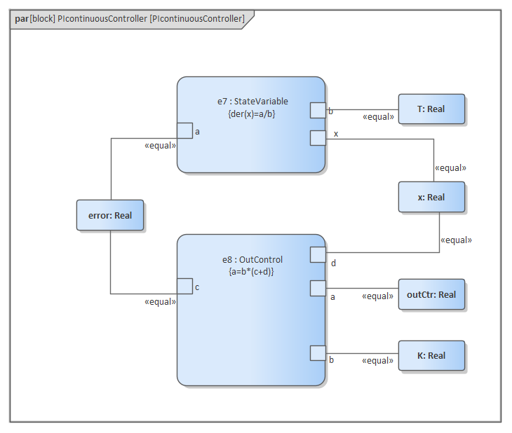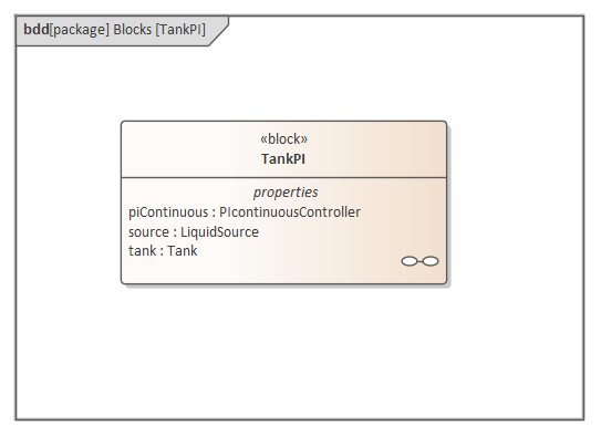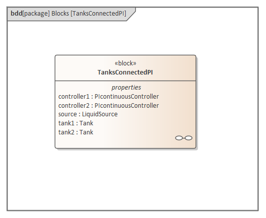 In this section we will walk through the creation of a SysML parametric model for a Water Tank Pressure Regulator, composed of two connected tanks, a source of water and two controllers, each of which monitors the water level and controls the valve to regulate the system.