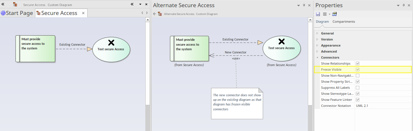 The Freeze Visible connectors feature is a useful way of ensuring that a diagram set up at a certain point is not automatically updated when new relationships are added to the repository that connect two or more objects on the diagram. By setting the diagram connectors' Freeze Visible property the diagram owner is telling the tool not to update this diagram when connectors are added somewhere else in the model.