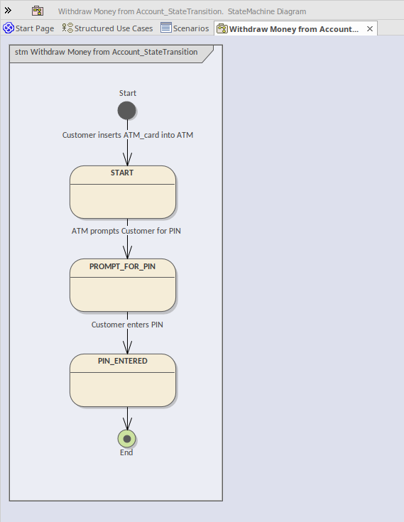 - The scenario steps become the Transition connectors between the States