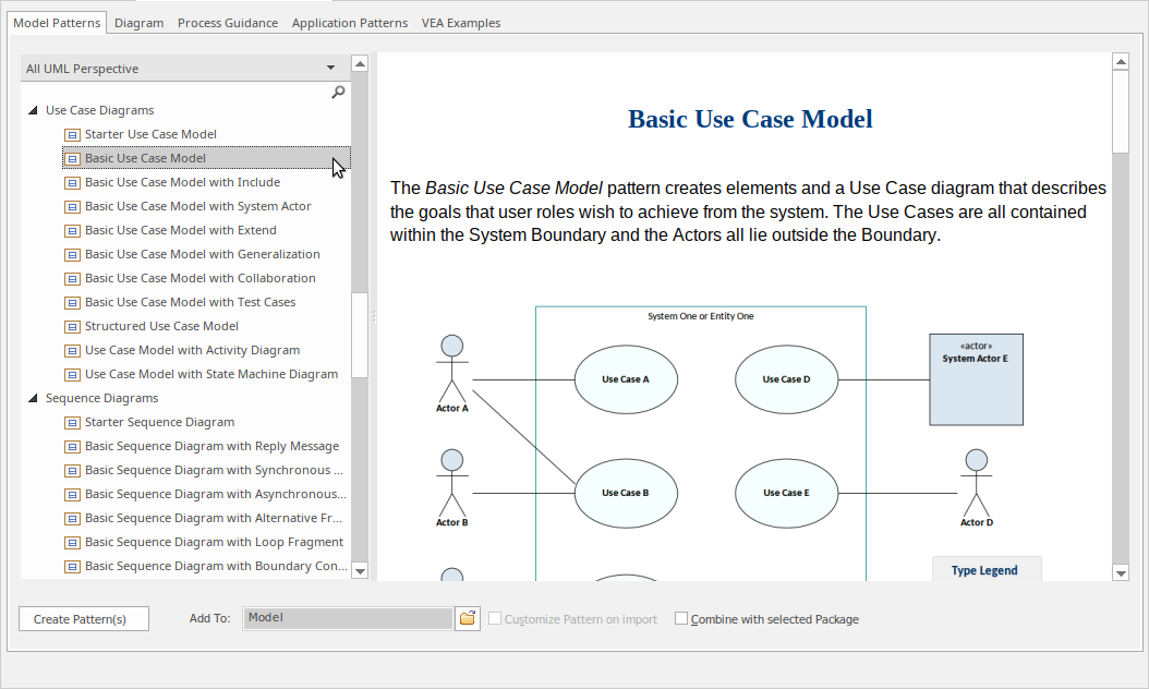 Doing this will cause the Model Wizard to appear in the central design area, pre-set to show all the UML Model Patterns (and there are quite a few!) Scroll down until you find the 'Use Case' section and select the 'Basic Use Case Model'. You should now be looking at something resembling this image: