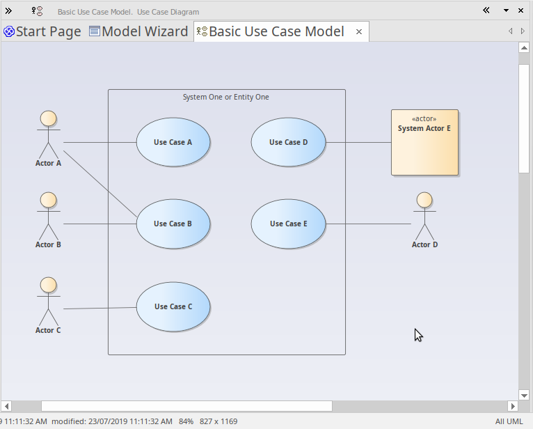 If you want to view or work with an existing diagram, you can open it by double-clicking on its icon in the Browser window. For this short introduction, you should locate the Basic Use Case Model diagram we created earlier and double-click on its icon to open it. If it is already open it will be selected and become the focus window.