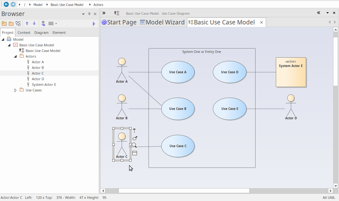 In our original diagram, Use Case A had a relationship to Actor A, so let's find Actor A in the Browser window and drag and drop it onto the new diagram.