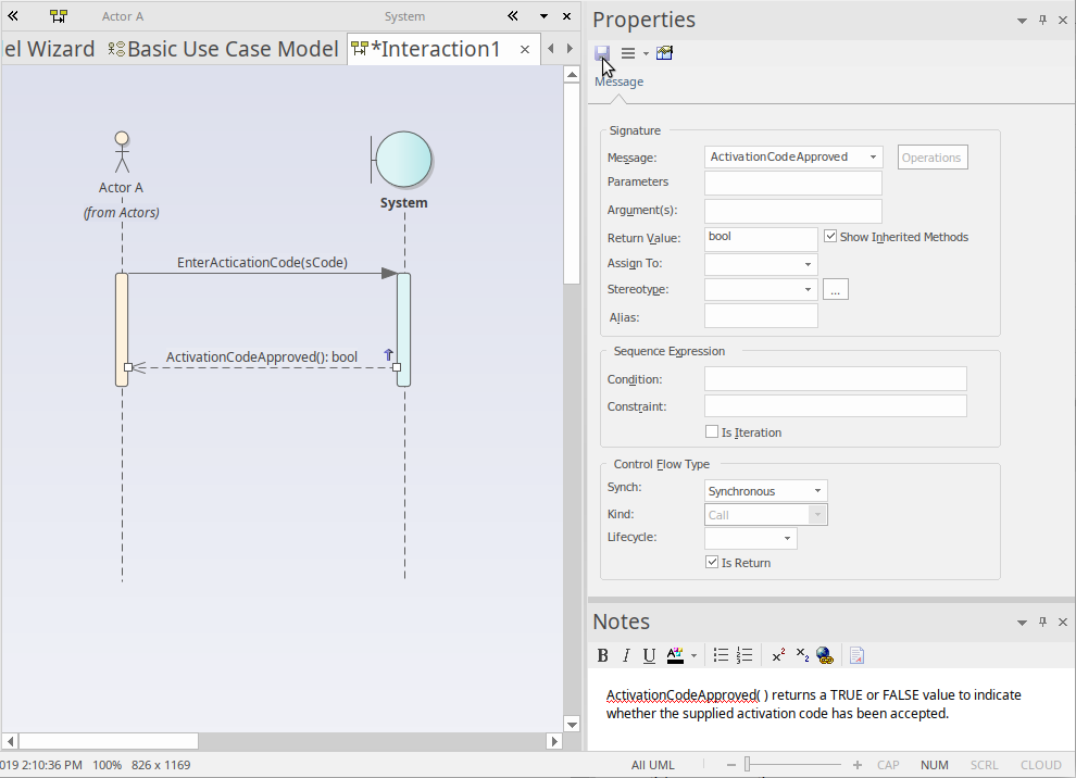 Now, click-and-hold on the Quicklink button, then drag across to the System Lifeline and release. This creates a new message in our model, between Actor A and System. Select the new message on the diagram and note that the Properties window updates to show the properties of the new connector, allowing you to edit the details. After entering a few details for the message and clicking the , your diagram workspace should resemble this image: