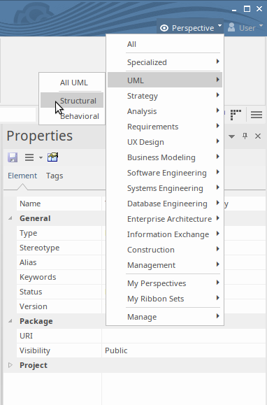 From the Perspectives menu, choose 'UML | Structural'.