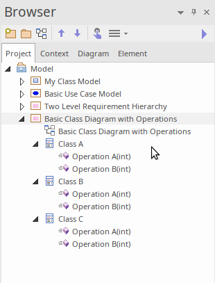 As you can see, there is an underlying model-level element in the Browser window that has a graphical representation in a diagram. Note that you can place a single model element in as many diagrams as you like, and that changing the name or notes or other element properties will be reflected immediately in all diagrams in which the element has been placed.