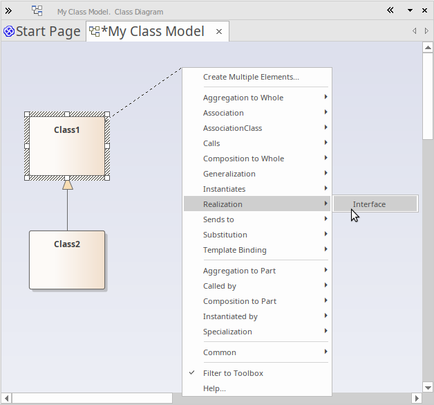 In the diagram 'My Class Model', click on Class1 to select it. The Quick Linker arrow should be visible beside the top-right corner of Class1. Click and drag the Quick Linker arrow to the right, releasing the mouse button in empty space on the diagram. This action displays a pop-up menu that prompts you to choose a relationship type, then an element type. From the menu, choose 'Realization | Interface'.