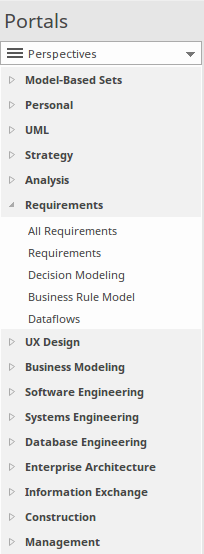 Enterprise Architect provides a rich set of more than 80 Perspectives built directly into the application, which have been crafted to align with the multitude of roles that modelers perform; these Perspectives are grouped into Sets that make finding the right Perspective quick and easy, and include: