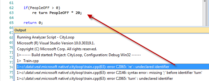 When you build an application using an Analyzer Script, compiler output is logged in the System Output window. You can double-click on any error message that appears here and be taken to the source code. When you do, the cursor is positioned on the line containing the error.